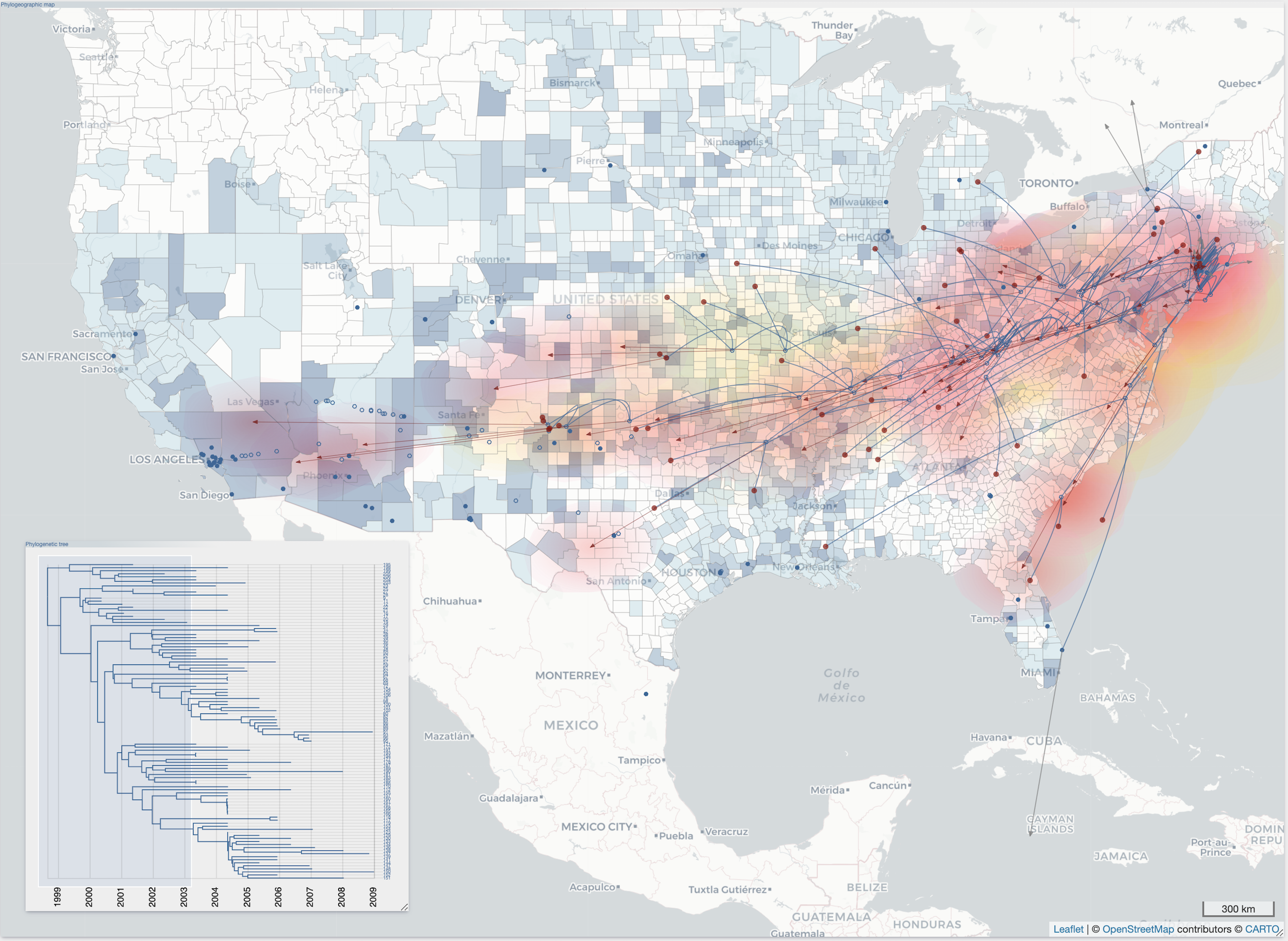 are represented on a cartographic background using graphical paths. The complete set of paths forms the phylogeographic scenario.